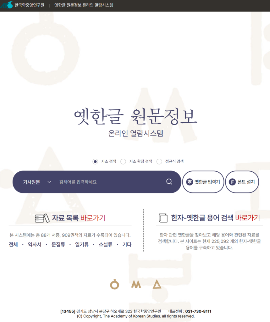 ▲『한국한자어사전(1996)』 ▲『이두사전(2020)』 ▲『한국한자자전(2023)』을 집대성해 온라인으로 서비스할 수 있도록 구성한 통합 검색 플랫폼