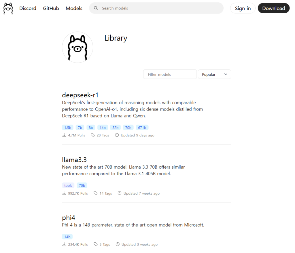 출처: “”https://ollama.com/library” 에 대한 설명”. Gemini Advanced 2.0 Experimental Advanced. 2025.01.31.
